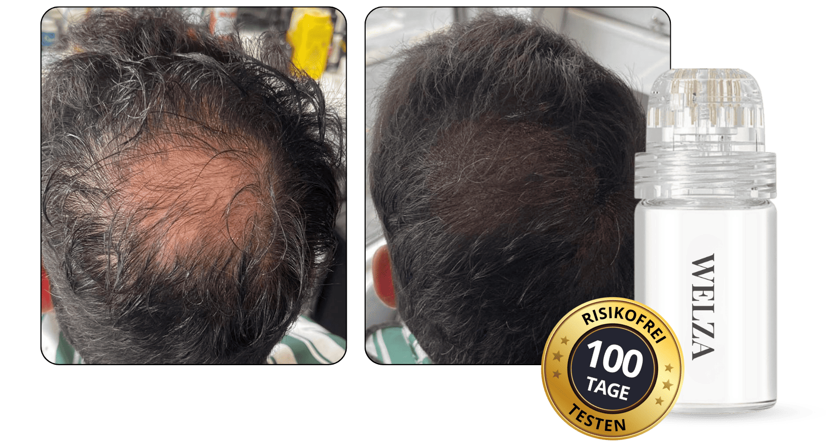 Sieh dir die sichtbaren Veränderungen von Männern an, die Welza vertraut haben — volleres, dichteres Haar bereits nach 4 Wochen.