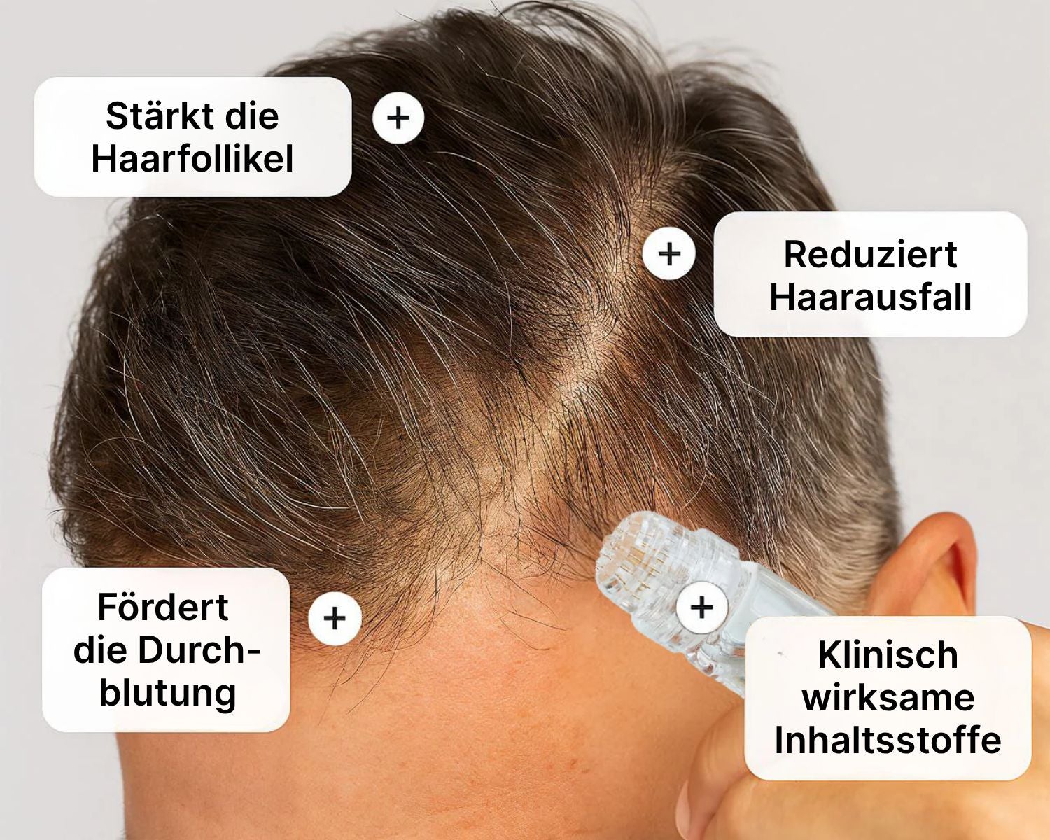 Die erste Heimanwendung mit Micro-Infusion, die Geheimratsecken und Haarverlust bei Männern an der Ursache bekämpft – ohne Medikamente oder Nebenwirkungen.